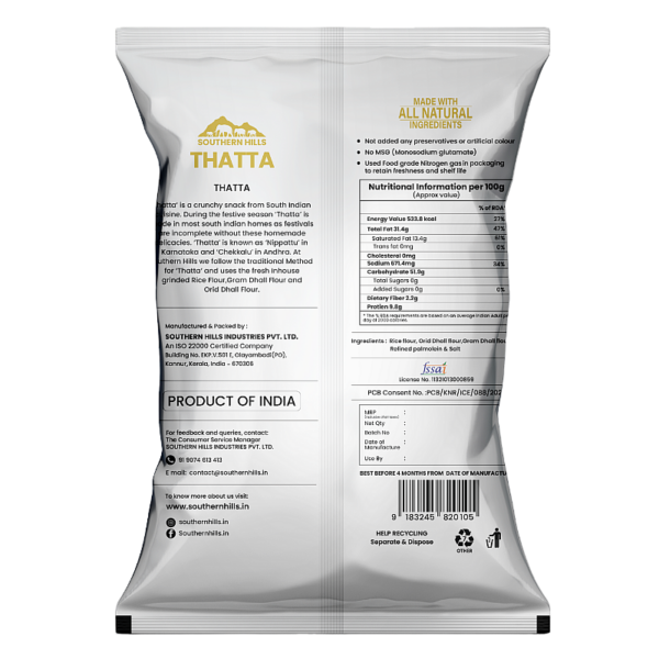 'Thatta' is a crunchy snack from South Indian cuisine during the festive season 'Thatta' is made in most South Indian homes as festivals are incomplete without these homemade delicacies. 'Thatta' is known as 'Nippattu' in Karnataka and 'Chekkalu' in Andhara. At Southern Hills, we follow the traditional method for 'Thatta' and use the fresh inhouse grinded rice flour, gram dhal flour